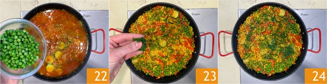 Añadid los guisantes 22, mezclad una última vez y cocinad durante 15-20 minutos a fuego medio-bajo. Durante la cocción es importante no mezclar la paella teniendo cuidado de no quemarla, de esta manera se formará una deliciosa costra dorada en contacto con la sartén. Si es necesario, podéis añadir más caldo vegetal. Cuando el arroz esté cocido y haya absorbido todo el líquido, retirad la sartén del fuego y dejad reposar durante unos minutos. Completad con un chorrito de aceite crudo y perejil fresco picado 23. La paella vegetariana está lista para ser disfrutada 24.