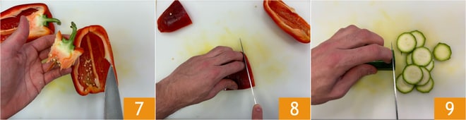 Cortad por la mitad el pimiento y eliminad el tallo 7, las semillas y los filamentos internos, luego cortadlo en tiras 8. Cortad los extremos del calabacín y cortadlo en rodajas 9.