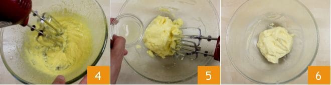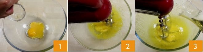 Para preparar la paillard con patatas y mayonesa al comino, comienza justamente con la mayonesa (puedes también consultar el procedimiento en la ficha de la Mayonesa). En un bol, reúne las yemas a temperatura ambiente bien separadas de las claras, agrega parte del zumo de limón (puedes verter toda la dosis ahora o dividirla para aclarar la salsa al final de la preparación) y añade el vinagre de vino blanco 1. Luego comienza a batir con la batidora eléctrica 2, añade el aceite de girasol en hilo muy fino 3.