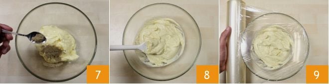 Ahora que la mayonesa está lista, añade el comino 7, mezcla 8 y luego cubre el bol con film transparente 9 para conservar la mayonesa en el frigorífico hasta el momento de su uso (si prefieres, puedes preparar en alternativa la Finta maionese senza uova, a la cual añadir el comino).