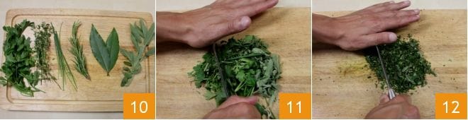 Ahora pasa a preparar las especias que servirán para condimentar las patatas. Toma la salvia, el perejil, el tomillo, el romero, el laurel y el cebollino 10 y pícalos muy finamente con un cuchillo o una media luna (11-12).