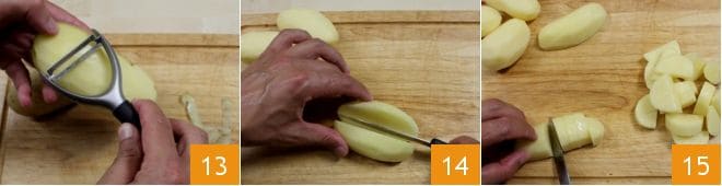 Luego, lava las patatas bajo el agua corriente, después pélalas con un pelador 13 o la hoja de un cuchillo pequeño y divídelas por la mitad 14. Coloca cada mitad en la tabla de cortar con la parte del corte hacia abajo y corta en medias lunas de aproximadamente 1 cm de grosor 15.