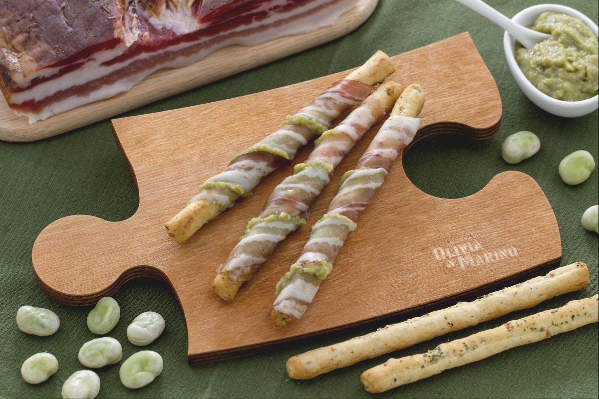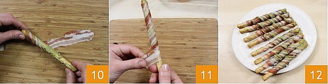 Una vez untado el palito con el puré de habas, envuélvelo con una loncha de panceta 10, siempre dejando libre un extremo del palito 11. Repite ahora la operación con todos los palitos. ¡Tus palitos con puré de habas y panceta están listos, solo queda servirlos! 12
