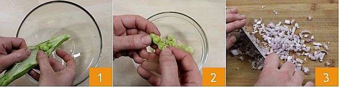 Para preparar los palitos con puré de habas y panceta, comienza desgranando las habas 1 y eliminando la piel exterior más dura 2. Pica la chalota 3,