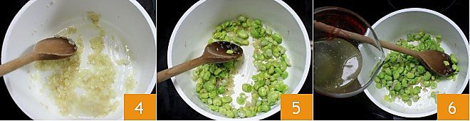 ponla a dorar durante unos minutos con un poco de aceite de oliva virgen extra en una sartén antiadherente 4, luego añade las habas 5 y el caldo de verduras 6 y deja que se cocinen a fuego lento durante unos 30 minutos.