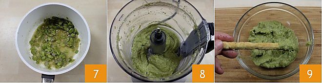 Una vez cocidas, sala y pimienta las habas al gusto 7. Tritura ahora las habas con una batidora de mano o un procesador de alimentos para obtener un puré homogéneo 8. A este punto, comienza a preparar los palitos. Pon un poco de puré de habas sobre un palito 9. Unta el puré cuidando de dejar libres un par de centímetros de un extremo, para poder sostener el palito con la mano.