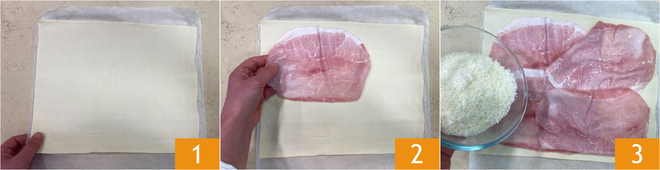 Para preparar los palitos de hojaldre, desenrolla la masa de hojaldre sobre la superficie de trabajo con su papel de horno 1. Coloca las lonchas de jamón por toda la superficie, cuidando de dejar 1 cm libre a lo largo de los bordes 2, luego espolvorea con el Parmesano Reggiano rallado 3.