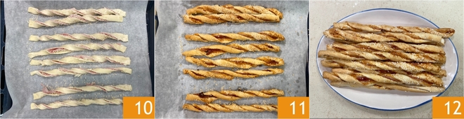 Transfiere los palitos uno a uno a una bandeja forrada con papel de horno 10 y hornea en un horno ventilado precalentado a 170° durante unos 25 minutos. Una vez dorados, retíralos del horno 11 y deja que se templen. ¡Tus palitos de hojaldre están listos para ser servidos, fríos o tibios 12!
