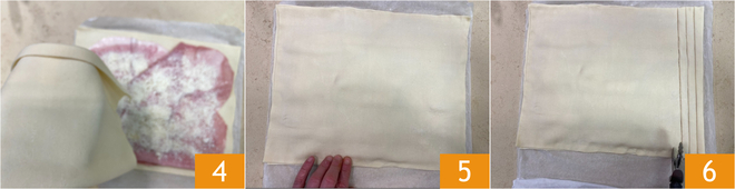 Cubre con el segundo rollo de masa de hojaldre 4 y sella los bordes presionando con los dedos 5. Con una rueda cortapastas, corta tiras de aproximadamente 1 cm de ancho 6.