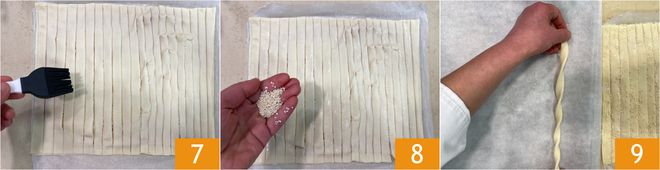 Pincela la superficie con agua 7 y espolvorea con semillas de sésamo 8. En este punto, toma una tira a la vez y enróllala para formar una espiral 9.