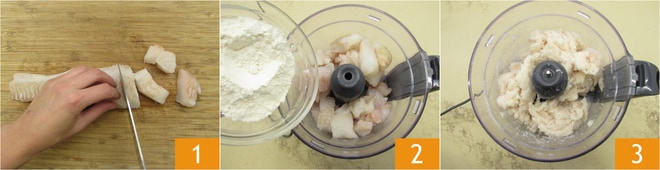 Para preparar los palitos de pescado, cortad el bacalao en trozos 1 y ponedlo en un procesador de alimentos con cuchillas junto con la harina 2. Triturad hasta que el bacalao se despegue de las paredes 3.