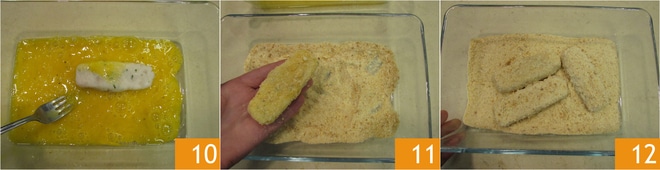 Pasad cada palito por los huevos batidos con sal y pimienta 10 y luego por el pan rallado 11, repetid esta operación dos veces para obtener un empanado más crujiente 12.