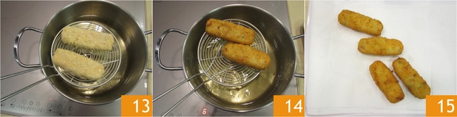 Calentad el aceite a 165°, freíd un máximo de dos palitos a la vez 13 durante unos 2 minutos, hasta que estén bien dorados 14. Escurrid los palitos de pescado sobre papel absorvente y servidlos calientes 15.