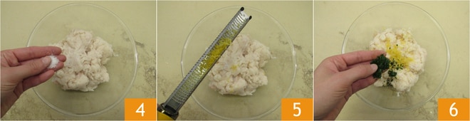 Pasadlo a un bol y condimentad con sal 4, ralladura de limón 5 y perejil picado fino 6. Mezclad para amalgamar.