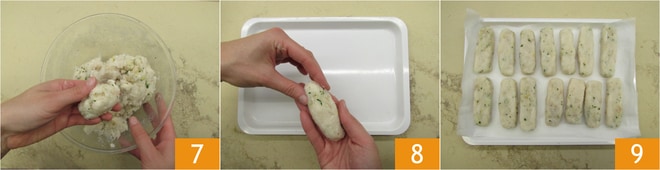 Tomad una porción de masa de aproximadamente 55 g 7 y trabajadla con las manos húmedas 7 intentando obtener un palito plano 8. Colocad los palitos en una bandeja forrada con papel de horno 9.