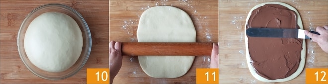 Cuando la masa haya duplicado su volumen 10, estiradla sobre la superficie de trabajo ligeramente enharinada hasta formar un rectángulo de 24x40 cm 11. Untad la Nutella en toda la superficie con la ayuda de una espátula, asegurándoos de dejar libre aproximadamente 1 cm del borde 12.
