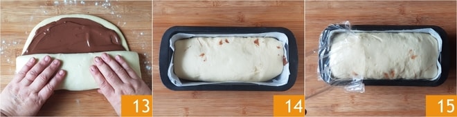 Enrollad la masa desde el lado más corto del rectángulo 13 e introducid el rollo obtenido en un molde de plumcake de 25x11 cm que previamente habréis forrado con papel de horno, con el cierre hacia abajo 14. Cubrid el molde con film plástico y dejad leudar en el horno apagado con la luz encendida durante al menos una hora, o hasta que la masa haya alcanzado el borde del molde 15.