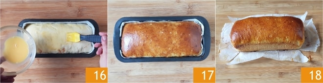 Transcurrido este tiempo, pincelad la superficie con la mezcla de yema y leche 16, luego hornead en horno estático precalentado a 180° durante unos 20-25 minutos, colocando el molde en el estante medio. Una vez cocido, sacadlo del horno y dejad enfriar completamente vuestro pan brioche con Nutella en el molde 17 antes de desmoldarlo 18 y cortarlo en rebanadas.