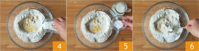 Añadid la mitad de la leche 4 y la sal 5 y mezclad de nuevo con el tenedor 6.
