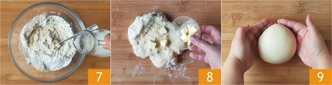 Finalmente incorporad la leche restante 7 y continuad amasando la mezcla en la superficie de trabajo. Añadid un trozo de mantequilla a la vez 8, asegurándoos de agregar el siguiente solo cuando el anterior haya sido completamente absorbido. Amasad hasta obtener una masa lisa y firme. Formad una bola 9 y devolvedla al bol, cubrid con film plástico y dejad leudar en el horno apagado con la luz encendida durante al menos una hora, o hasta que duplique su volumen.