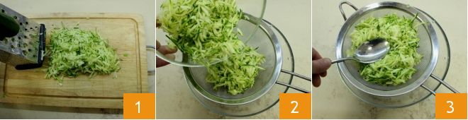 Para preparar el zucchini bread, comienza con los calabacines: lávalos y córtales los extremos. Luego rállalos 1 y colócalos en un colador para escurrir el agua de vegetación 2. Para facilitar la salida del líquido, puedes presionar con el dorso de una cuchara 3.
