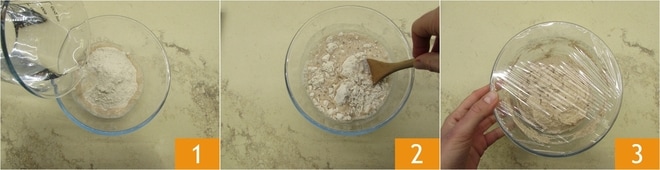 Para preparar el pan de espelta, comiencen con la autolisis: en un bol viertan la harina de espelta y el agua 1, mezclen con una cuchara de madera 2, hasta obtener una mezcla homogénea. Cubran con film y dejen reposar durante una hora 3. Este proceso permite que la harina absorba mejor el agua y desarrolle una mejor red de gluten.