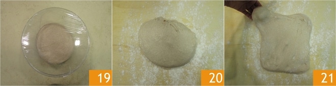 Realicen este movimiento 4 veces para tomar los bordes de la masa, girando el bol 16. Cubran con un paño 17 y dejen reposar durante otros 15 minutos. Repitan esta operación 3 veces más siempre cada 15 minutos, siempre haciendo 4 pliegues a la masa. Después de haber realizado los pliegues, cubran con film 18.