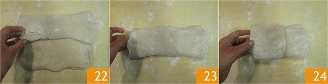 Doblen entonces el lado superior hacia el centro 22 y luego traigan encima el inferior para que coincidan 23. En este punto, lleven hacia el centro la masa, doblándola lateralmente primero de un lado 24 y luego del otro.