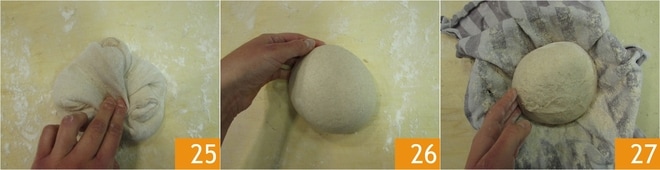 Lleven las esquinas del rectángulo obtenido hacia el centro, de modo que se forme una especie de paquete 25; volteen y boleen la masa hasta obtener una forma esférica 26. Trasladen al interior de un bol, de 20x9 cm donde habrán dispuesto previamente un paño bien enharinado 27.