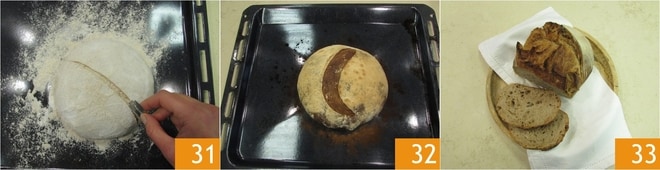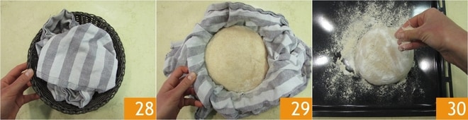 Cubran con los bordes del paño 25 y dejen fermentar a temperatura ambiente durante 6 horas. A este punto 29 transfieran la masa volcando el bol sobre una bandeja de horno ligeramente enharinada 30.