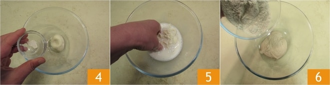 Paseamos a la masa: en un bol pongan la masa madre y la levadura de cerveza fresca 4. Añadan una parte del agua y suavicen todo con las manos 4, no será necesario disolverlos completamente. En otro bol grande viertan la masa obtenida de la autolisis 5, la harina de espelta 6 y la de manitoba.