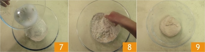 Incorporen las levaduras disueltas en agua 7 y el agua restante. Amasen en el bol con las manos durante unos 5 minutos 8 hasta obtener una masa homogénea y elástica 9.