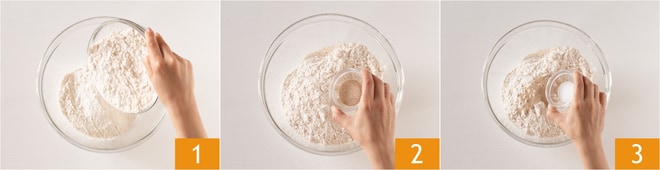 Para preparar el wool roll bread, comienza haciendo la masa. Vierte las dos harinas en un bol 1, añade la levadura seca 2 y el azúcar 3.