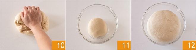Cuando obtengas una masa homogénea, transfiérela a una superficie y trabájala con las manos 10 hasta que esté lisa. Dale forma esférica a la masa y colócala en un bol 11. Cubre con film transparente y deja que leve en el horno apagado, solo con la luz encendida por aproximadamente 2 horas, hasta que la masa haya duplicado su volumen 12.