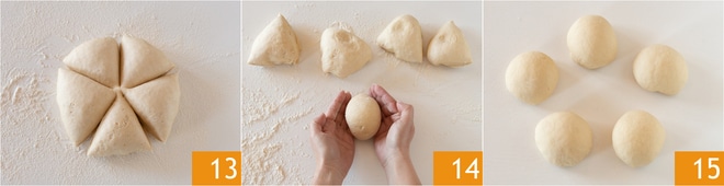 Pasado el tiempo de reposo de la masa, transfiérela a la superficie ligeramente enharinada y divídela en 5 partes iguales 13. Toma una de las bolitas y dale forma esférica 14. Haz lo mismo con las otras 4 15.