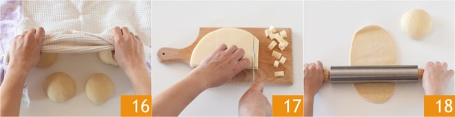Cubre con un paño 16 y déjalas reposar otros 30 minutos. Mientras tanto, corta el provolone en cubitos 17. Extiende cada bolita con el rodillo hasta obtener un óvalo 18.