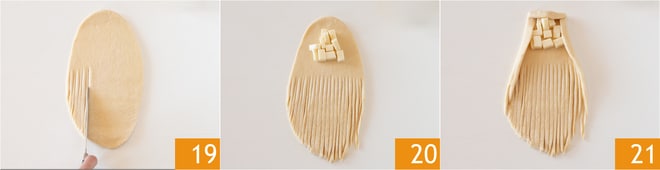Ahora haz cortes cercanos, con un cuchillo o un cortador, solo en la mitad inferior del óvalo de masa 19. Coloca en el centro de la parte superior los cubitos de queso 20 y cierra sobre el queso los bordes laterales y el superior 21.