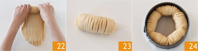 Comenzando por la parte superior, enrolla 22 hasta obtener un cilindro 23. Continúa de esta manera y a medida que los prepares, colócalos dentro de un molde de 22 cm de diámetro y 6 cm de alto, forrado con papel de horno y previamente aceitado en los bordes. Colócalos uno al lado del otro de manera que cubran todo el perímetro del molde 24. Luego cubre con film transparente.