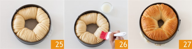 Deja que leve una hora más, en un lugar templado, hasta que haya alcanzado la altura del molde 25. Pincela la superficie del pan brioche con leche 26 y hornea en horno estático precalentado a 180°C durante unos 35-40 minutos. Cuando esté bien dorado, sácalo del horno 27, espera unos minutos y sírvelo.