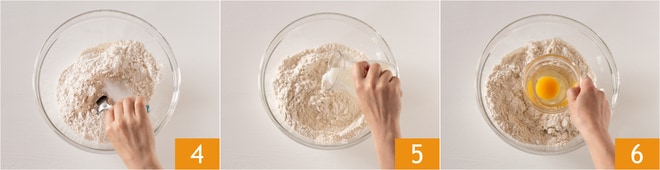 Mezcla con una cuchara 4. Añade la leche 5 y sigue mezclando. Luego vierte el huevo 6 y continúa amasando, verás que la mezcla comenzará a tomar forma.