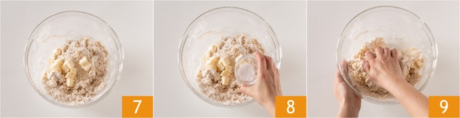 Incorpora la mantequilla blanda 7 y la sal 8. Luego trabaja bien la masa con las manos 9.