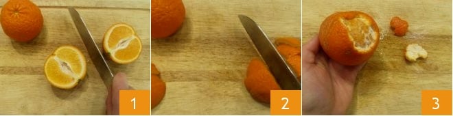Para preparar el pan de mandarina, lava y seca las clementinas. Luego toma 300 g de la dosis total y córtalas groseramente dejando la piel (1-2). Limpia el resto de las clementinas 3,