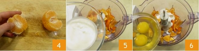 divídelas por la mitad 4. Luego vierte en la batidora las clementinas peladas y las cortadas groseramente enteras, el yogur 5, los huevos 6