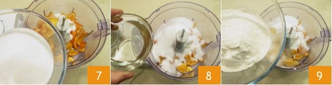 el azúcar 7, el aceite de semillas 8, la harina 9