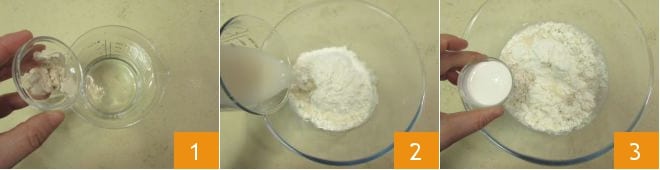Para preparar el pan de San Petronio comenzad con la masa. Disolved la levadura fresca en el agua 1. En un bol verted la harina, el agua con la levadura disuelta 2 y la nata 3.