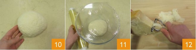 Cuando hayáis obtenido una masa lisa, formad una bola 10 y ponedla en un bol. Cubrid con film plástico 11 y dejad que fermente durante 2 horas a una temperatura de 26-28°C (el horno apagado con la luz encendida irá muy bien). Mientras tanto, podéis obtener las lascas de Parmigiano que os servirán para el relleno.