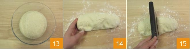 Transcurrido el tiempo de fermentación 13, colocad la masa sobre una tabla ligeramente enharinada 14 y divididla en 2 porciones de aproximadamente 360 g cada una.