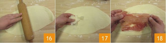 Estirad una porción de masa con el rodillo 16, formad un óvalo de aproximadamente 40 cm de diámetro y distribuid el relleno de lascas de Parmigiano 17, lonchas de jamón 18