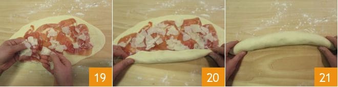 y nuevamente lascas de Parmigiano 19. Enrollad la masa y sellad bien los extremos 21.