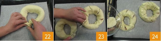 Trasladad a una bandeja forrada con papel de horno y unid los extremos para formar un roscón 22. Estirad y formad también el otro pan utilizando la segunda porción de masa. En este punto, realizad unos cortes en ambos roscones con la hoja de un cuchillo 23. Finalmente, distribuid algunos trocitos de mantequilla y espolvoread con el Parmigiano rallado 24.